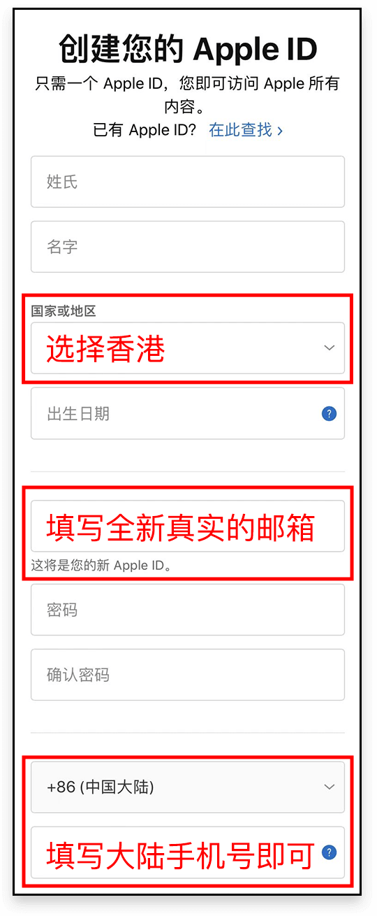 • 邮箱:需要准备一个从未注册过 Apple ID 的 <全新真实>邮箱用来收取验证码;