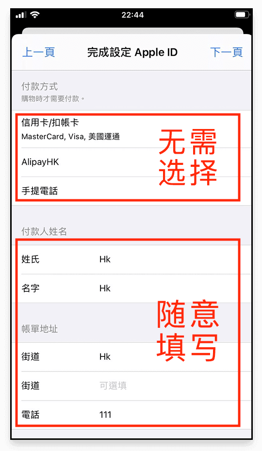 根据提示输入您的个人相关信息,注意在国家和地区请选择 <香港>,另外: